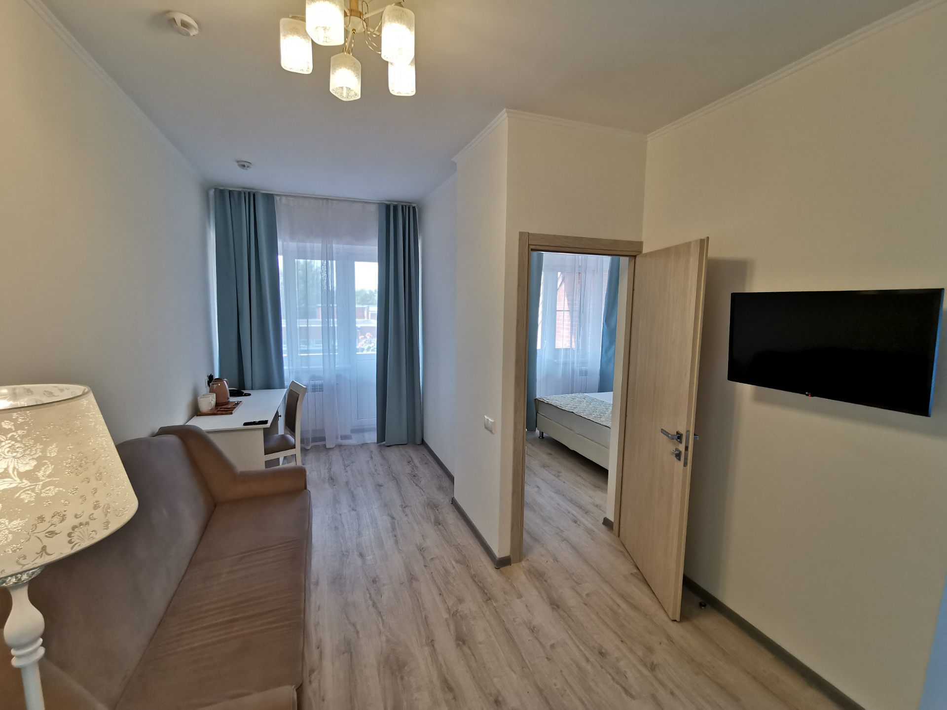 Небольшие, но уютные двухкомнатные номера с ремонтом. Соременная мебель, стиль и комфорт. Спальня с одной/двумя кроватями, балконом и видом на лес.